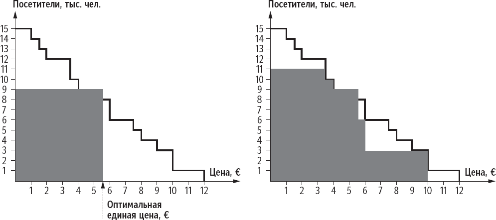 Ценовая дифференциация (на рис. 12) намного лучше использует потенциал прибыли в треугольнике, чем единая цена (слева). Общая прибыль при нелинейном ценообразовании составляет €67 500, то есть на 37,7 % больше, чем прибыль в €49 500, которую заработал бы кинотеатр на единой цене. Количество посетителей тоже возрастает – с 9000 в месяц до 11 000 при средней стоимости билета €6,14, в отличие от €5,50 в случае единой цены. Такой одновременный рост объема продаж и цены невозможен при единой цене и стандартной (нисходящей) кривой спроса. Вы тоже можете добиться таких результатов с подобной сложной ценовой структурой, что позволит вам использовать два меньших треугольника прибыли и значительно увеличить общую прибыль. Эта структура намного эффективнее, чем единая ценовая структура, в привлечении покупателей с высокой готовностью платить (больше €5,50) и низкой готовностью платить (меньше €5,50). Внедрить такую ценовую структуру в нашем примере было несложно. Клиенты, которые участвовали в программе, получали именную карту, на которой делалась отметка после каждого посещения в течение месяца. В отличие от примера с пивом, эта карточная система предотвращает арбитраж, так как кинотеатр отслеживает фактические посещения каждого индивида.