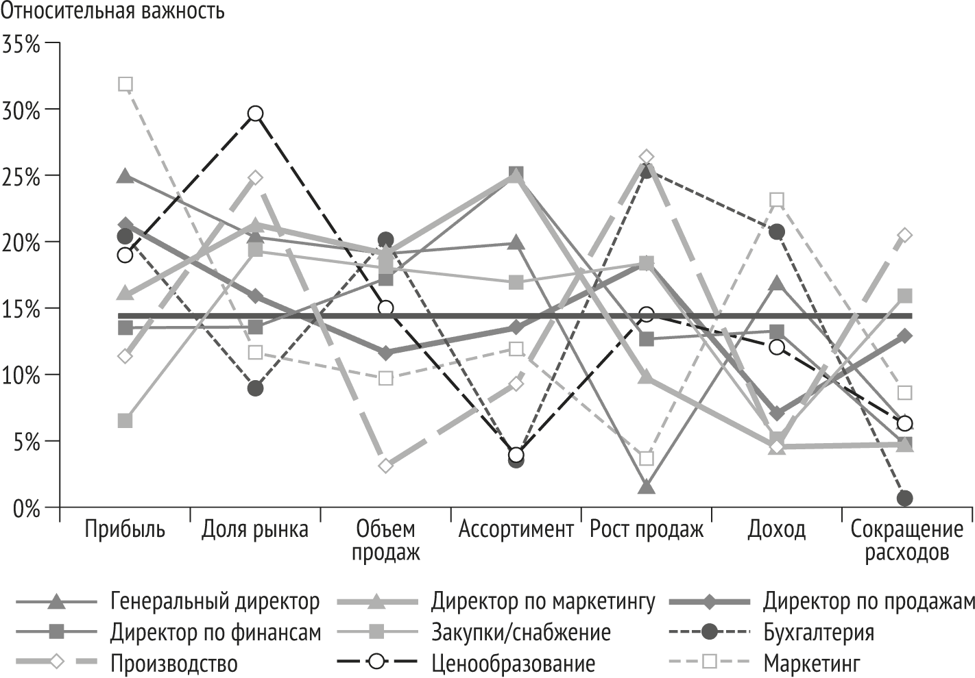 Рисунок 18 показывает результаты одного из наших семинаров. Сразу видна огромная разница в значимости целей для генерального директора, руководителей маркетингового, финансового отделов, отделов продаж и закупок. Участники были в ужасе. Перед этим они считали, что работают ради одной цели. Проблема в том, что они никогда не ставили себя перед необходимостью выбирать цели. После семинара они провели более объективное и подробное обсуждение. В итоге согласовали между собой приоритеты продукта: максимально увеличить долю рынка, но при этом увеличить общую прибыль минимум на 10 %.