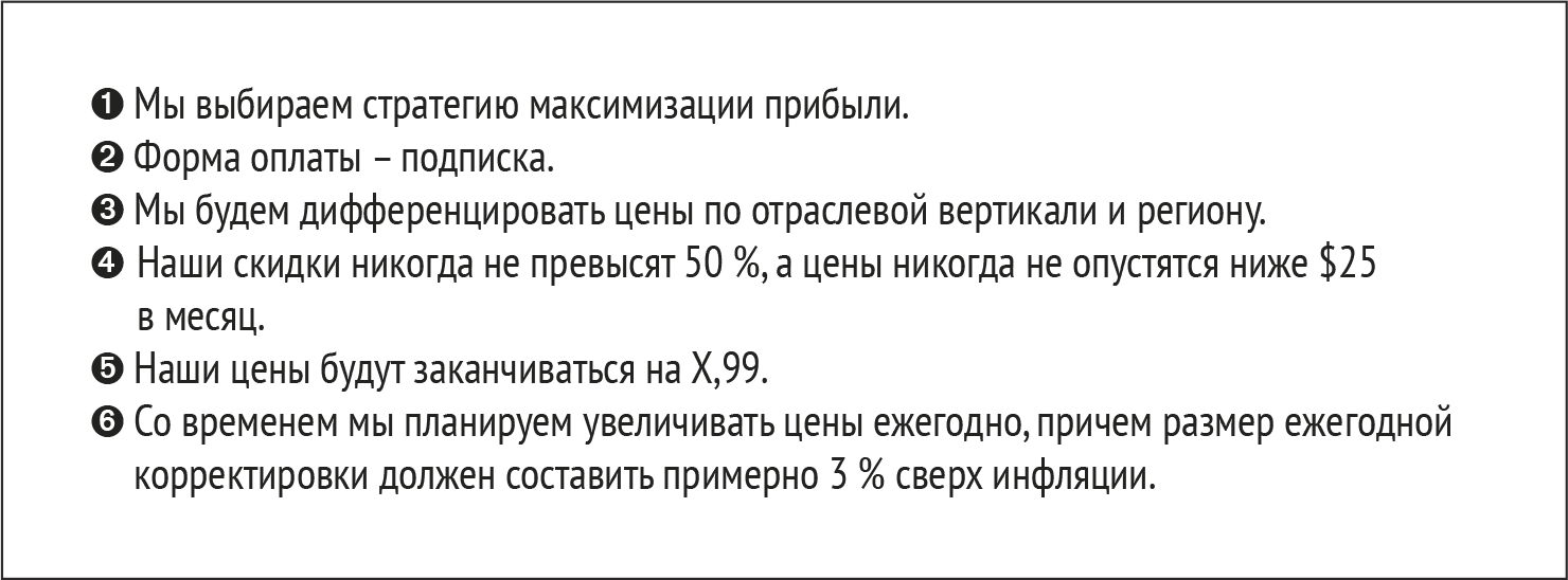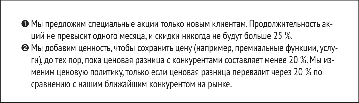 Итак, вы выбрали подходящую ценовую стратегию, и следующий шаг – разработать правила, по которым вы будете действовать, чтобы реализовать свою стратегию. Сформулировав принципы ценообразования на раннем этапе, вы сможете проводить мониторинг ценовой стратегии и избегать необдуманных реакций после выхода продукта на рынок. (Подробнее об этом в главе 12.) Рассмотрим пять основных принципов ценообразования.