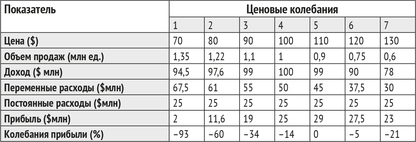 Эта информация позволяет подсчитать доход (цена ? продажи). Учитывая переменные расходы $50 на единицу продукции и постоянные расходы в размере $25 млн на эксплуатацию оборудования и персонал, можно рассчитать прибыль (доход – расходы). Таблица показывает прибыль по семи разным ценам.