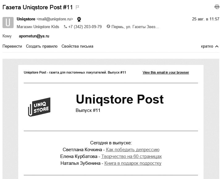 Рисунок 23. Рассылка журнала книжного магазина Uniqstore.