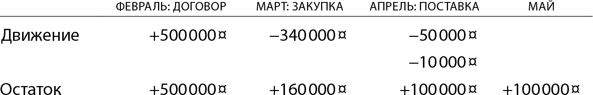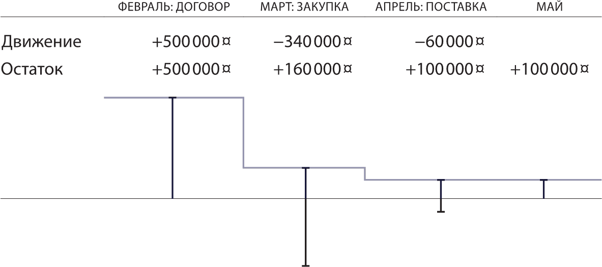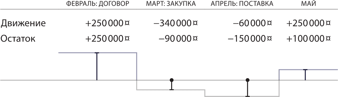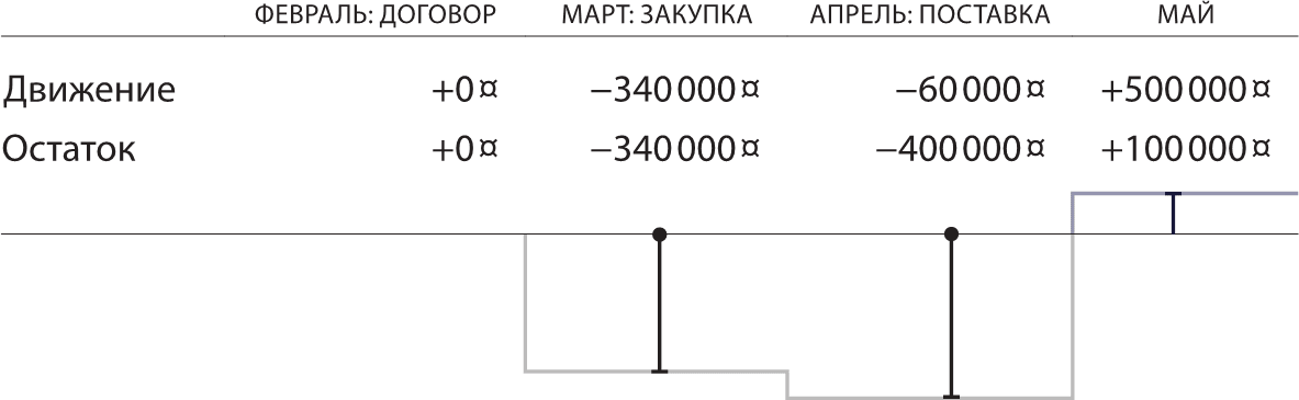 Из отчета продавца бумаги видно, что при всех трех вариантах оплаты у него в итоге остается 100 тысяч рублей. Но при трех последних вариантах в остатке появляются отрицательные значения — это и есть кассовый разрыв.