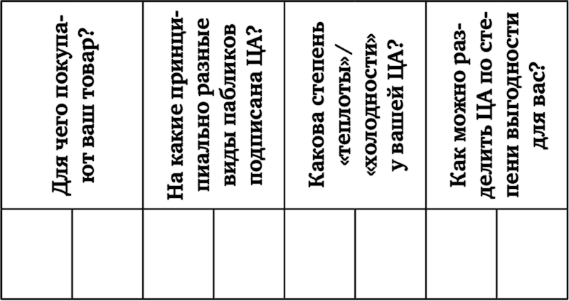 Если текст не умещается в таблицу, начертите ее в блокноте и аккуратно заполните. Чем качественнее и понятнее для себя вы разберете свою аудиторию, тем лучше будет настроена таргетинговая реклама.