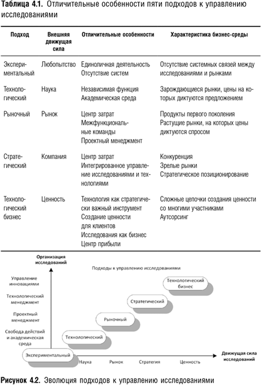 Пять подходов к управлению исследованиями сменяли друг друга эволюционным путем, в ответ на изменения бизнес-среды, которые побуждали руководство подразделений НИОКР изобретать все более эффективные системы оперирования во все более сложных условиях. Этот исторический анализ развития управления исследованиями имеет свои преимущества, поскольку новые формы организации исследований возникали постепенно, так же как в процессе эволюции возникали новые виды энергоснабжения для поддержки усложняющихся систем жизнеобеспечения. В обоих этих эволюциях новые механизмы полностью не вытесняли предыдущие, а лишь отодвигали их на задний план или принижали их значение. Это означает, что в разных бизнес-контекстах могут применяться разные подходы к управлению исследованиями. Так, на развивающихся рынках, возможно, по-прежнему целесообразно применять «простейший» технологический подход; в свою очередь, экспериментальный метод всегда уместен в исследованиях, где огромную роль играет интуиция; а когда расходы на исследования должны быть как можно ниже, нет нужды прибегать к пятому подходу. В таблице 4.1 дано сравнение этих пяти подходов к управлению исследованиями и их отличительные особенности, соответствующие конкретным состояниям бизнес-среды.