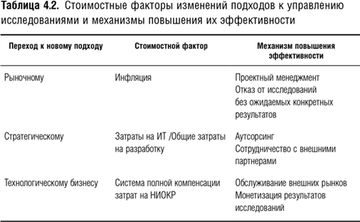 В таблице 4.2 представлена взаимосвязь между конкретными подходами к управлению исследованиями и условиями рынка и бизнес-среды. При каждой смене подхода исследовательская деятельность должна была усложняться в ответ на более сложные внешние вызовы и требования рынков, меняющиеся под воздействием новых внешних драйверов. Но в то же время при каждом изменении подхода к управлению исследованиями компаниям приходилось создавать более эффективную систему контроля затрат. Все факторы, послужившие причиной смены подхода, имеют отношение к управлению расходами, как и сопутствующие изменения в способе организации исследований (подробнее см. табл. 4.2).