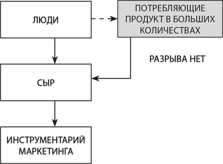 Как определить, какой маркетинг мы проводим – латеральный или вертикальный? Главный признак, позволяющий отличить латеральный маркетинг от вертикального, – это образование разрыва в результате смещения. Например, если мы попробуем сместить атрибут «быстрый» для автомобилей, разрыв не появится, и устранять его не потребуется. Точно так же не приведет к появлению разрыва смещение атрибута «низкий расход горючего» для того же автомобиля или «потребляющие продукт в больших количествах» для покупателей сыра (см. рис. 6.12). Отсутствие разрыва означает, что мы используем вертикальное, а не латеральное мышление и просто разбиваем на части уже имеющийся рынок или товар.