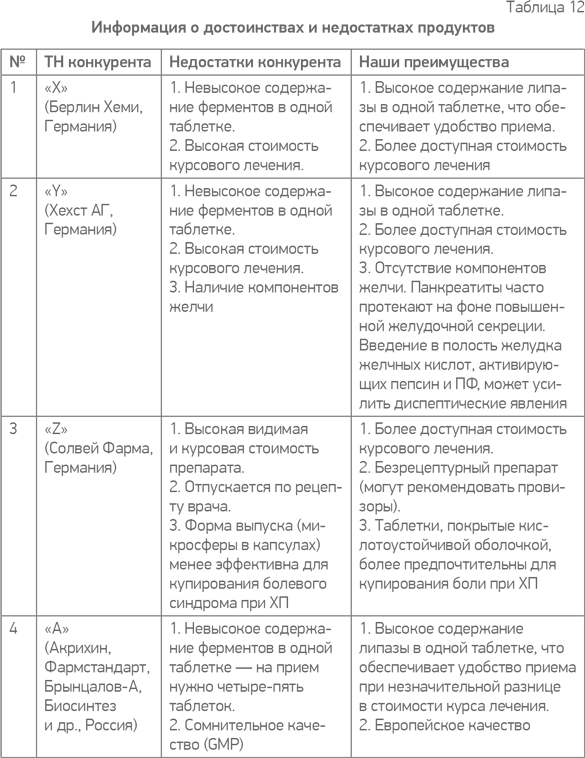 В результате сбора и анализа информации может появиться примерно такая таблица, демонстрирующая в простой и наглядной форме преимущества и недостатки продукта компании и её конкурентов.