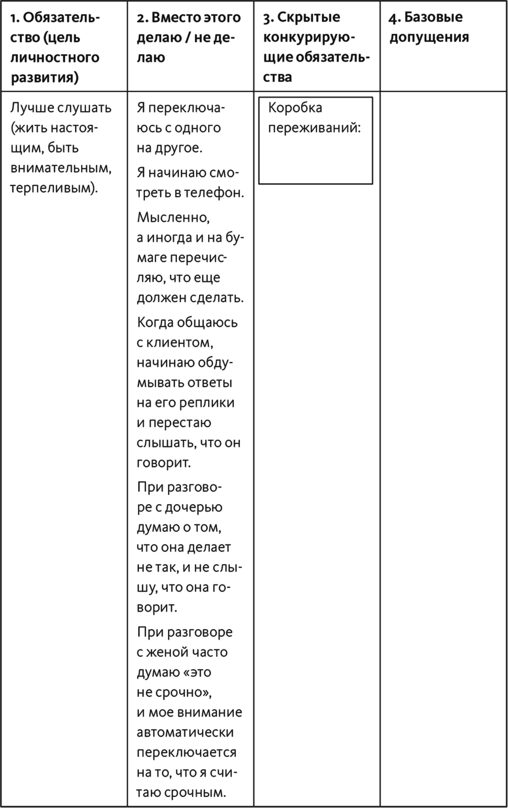 Если у вас с кем-то налажена регулярная обратная связь, есть тот, кто вас контролирует и оценивает, вы можете воспользоваться этим как дополнительным источником идей для записи в колонке 2. Если нет и у вас не получается создать хороший список своих контрпродуктивных действий, вот вам последний совет – для храбрых. Подойдите к людям, которым доверяете, которые на вашей стороне, и спросите их, не замечают ли они у вас поведение (или избегание), которое, по их мнению, мешает вам добиться цели. Будьте уверены: им есть что добавить в список! Поблагодарите их и начинайте записывать наблюдения в колонку 2. За работу! Когда закончите, пройдитесь еще раз по критериям, убедитесь, что ваши записи под них подходят. Не приступайте к следующему заданию, пока не заполните колонку должным образом и не внесете необходимые правки.