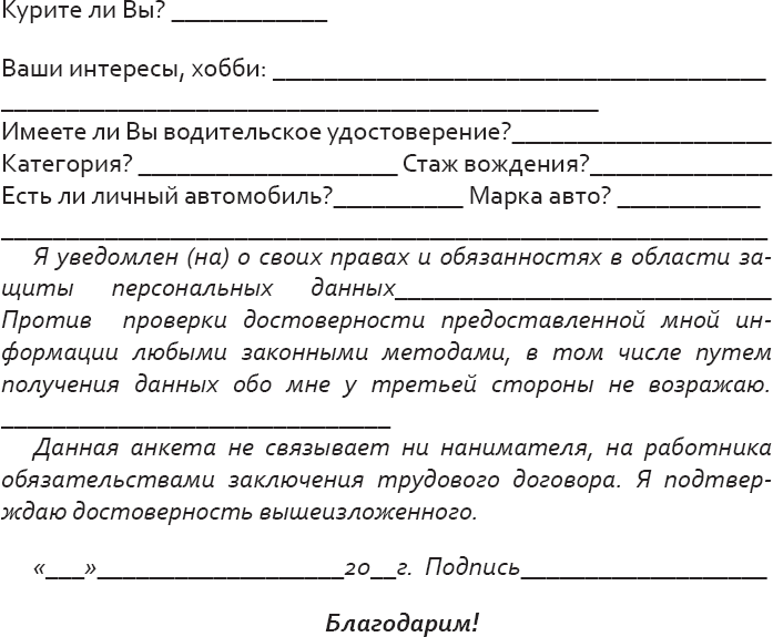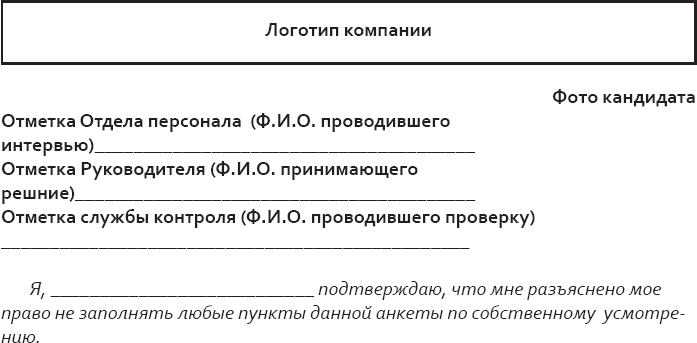 Вы можете разработать любой удобный для Вас формат анкеты (что-то добавить, что-то убрать), но обычно, она включает в себя следующую информацию.