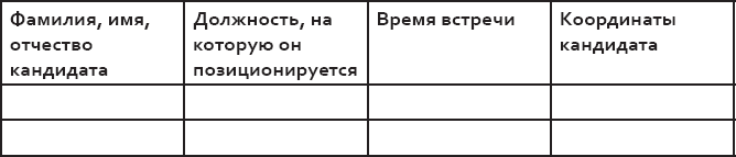 Если процесс подбора в Вашей компании не автоматизирован (Вы не пользуетесь SAP, E-staff или любой иной программой), то для собственного удобства можно использовать таблицу, приведенную ниже. В ней наглядно отражается информация о количестве собеседований, запланированных на день. Результаты встречи можно зафиксировать отдельно (либо дополнить данную таблицу).