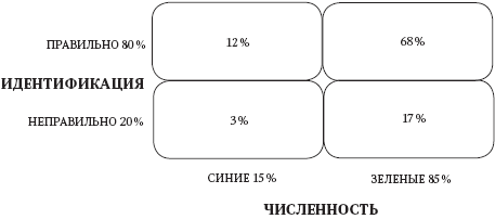 Если наша свидетельница права в 80 % случаев, то, как показано на рис. 6.1, из 85 зеленых такси она правильно опознает 68 как зеленые, а 17 как синие, а из 15 синих правильно опознает 12 как синие и три машины как зеленые, то есть неправильно. Из 29 автомобилей, которые она опознает как синие (12 + 17), 41,4 % (12/29) действительно синие, в то время как 58,6 % (17/29) на самом деле зеленые.