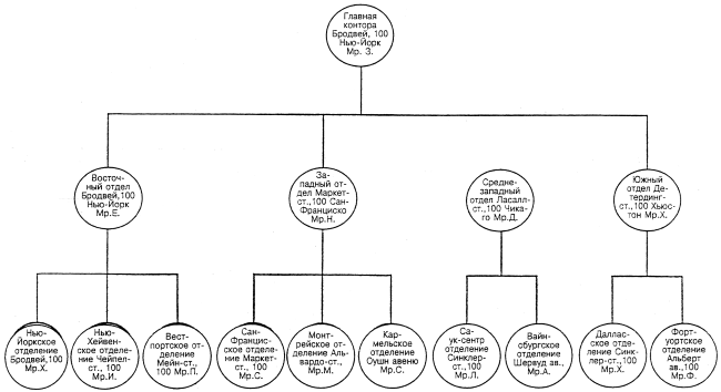 Если кто-нибудь предлагает подумать о какой-то конкретной организации или группе, первым вопросом должно быть: «Кто на самом деле входит в эту группу?» В случае небольшой группы самый удобный и информативный ответ – диаграмма размещения, которая показывает места расположения людей и имена тех, кто занимает эти места. Если рассматривается реально происходившая групповая встреча, рисунок принимает форму диаграммы рассаживания (рис. 5). В случае большой организации диаграмма размещения напоминает привычную организационную схему и указывает расположение ветвей, постов, церквей, кораблей, самолетов или отрядов, а также имена людей, которые размещены в каждом месте (рис. 6). Потребность в таких диаграммах свидетельствует о том, что предпочтительней не говорить о воображаемых группах, а определять, что в реальности произошло или происходит среди реальных специфических индивидов. Когда рассматривается группа, важно иметь классную доску, даже если заранее подготовлены распечатки схемы.