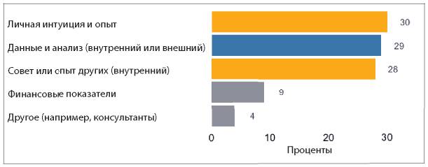 Здесь не все так просто. Многие компании искренне верят, что у них процесс принятия решений происходит на основе данных, но, к сожалению, интуиция по-прежнему правит бал. Вот некоторые факты: интуиция и персональный опыт заняли первые две строчки в рейтинге факторов, на основе которых топ-менеджмент принимает решения, согласно отчету компании Accenture в 2009 году (n = 600; рис. 9.2).
