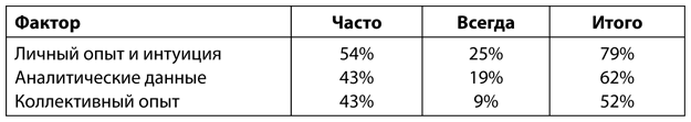 По результатам другого опроса, в котором приняли участие более 700 топ-менеджеров, 61 % респондентов заявили, что при принятии решений следует прислушиваться к практическому опыту, а не к цифрам, а 62 % опрошенных уверены, что часто необходимо и даже предпочтительно полагаться на интуицию и «мягкие» факторы[154].