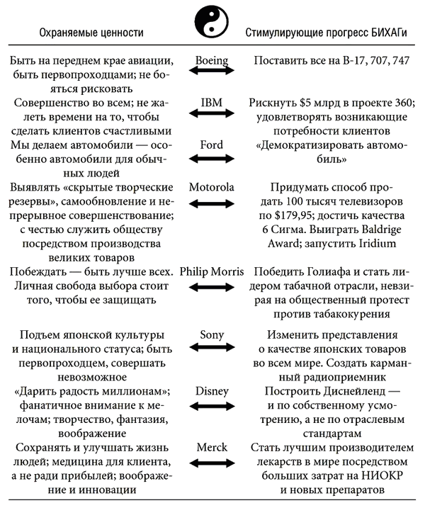 Более того, великие компании не следуют случайным БИХАГам, но лишь таким, которые поддерживают их ключевую идеологию и отражают их самосознание. Обратите внимание на связь между ключевыми ценностями и БИХАГами в следующем списке:
