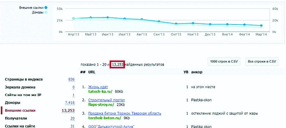 Итак, что же мы здесь видим? Мы видим, что в данный момент на сайт стоит 13253 ссылки. К тому же, на графике видна и динамика – то есть, мы видим, что за последний год количество ссылок уменьшилось.