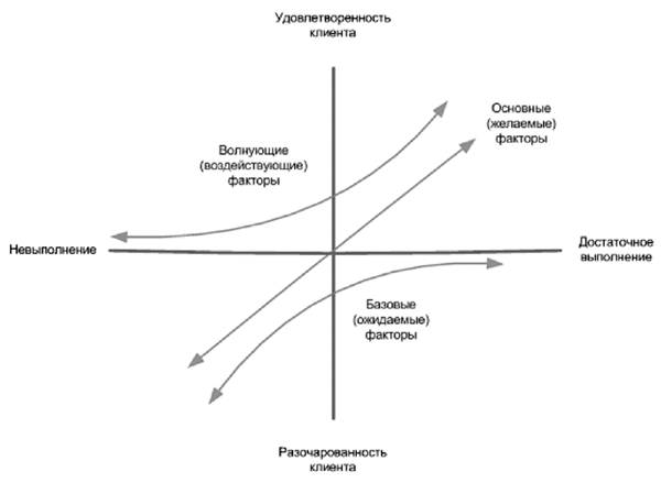 2. Требуемые (основные) факторы. Это факторы, для которых работает прямая линейная зависимость: чем меньше, тем хуже; чем больше, тем лучше. Например, вкус или оформление блюда. Чем еда вкуснее, чем она лучше оформлена, тем гость довольнее.
