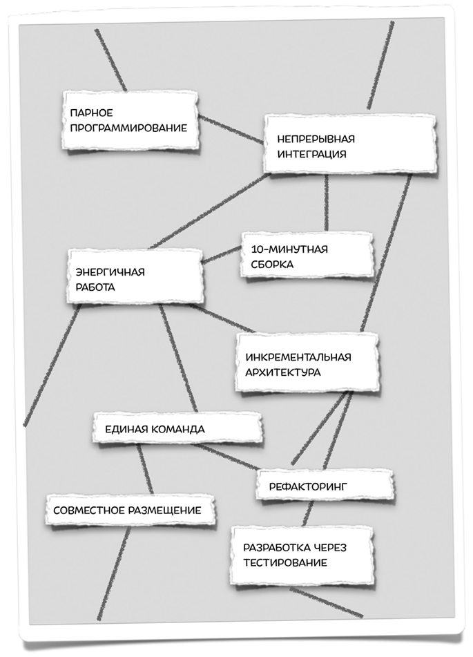 Мы отложили рассмотрение целостных практик до главы 7, потому что в сочетании с другими основными ХР-практиками они становятся понятнее, и команда не сможет освоить их по-настоящему, не имея образа мыслей, совместимого с ХР-ценностями и принципами. Если рассматривать практики по отдельности и реализовывать их одну за другой, то, скорее всего, получится результат «лучше-чем-ничего», который не окажет глубокого влияния на архитектуру продукта.