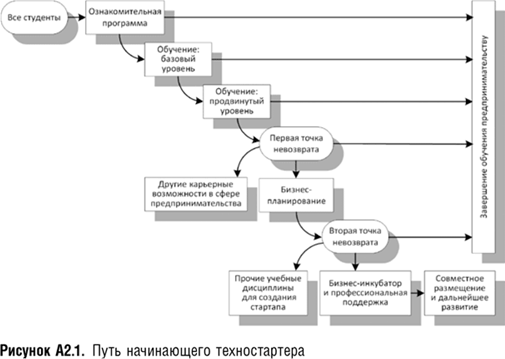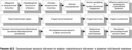 В идеале университетское образование студентов, которые планируют использовать результаты своих диссертаций или других исследовательских проектов в качестве основы для своих стартапов, должно быть синхронизировано с их развитием как предпринимателей и их обучением предпринимательству. На рис. А2.2 изображен системный подход к синхронизации технологического образования, обучения предпринимательству и создания новой компании: