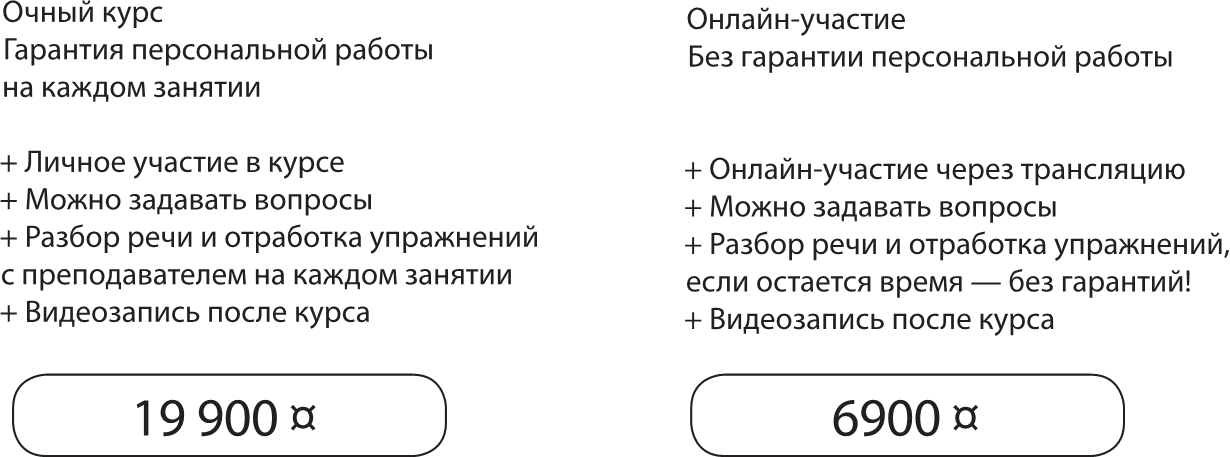 Пример. Школа ораторского искусства открыла онлайн-поток: люди платили 30 % от цены, чтобы подключаться к занятиям дистанционно. На странице, где люди регистрировались, было четко сказано: на каждом занятии разбираются выступления всех участников в классе (офлайн) и еще троих участников из онлайна. Если хотите гарантированно работать с преподавателем, приходите в офлайн за полную цену.