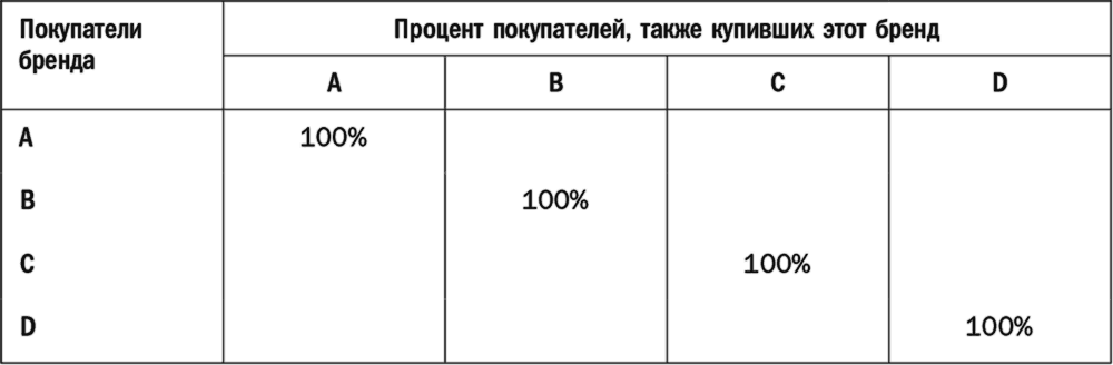 Таблица дублирования покупок[55] отражает, в какой степени у брендов, принадлежащих к одной категории, совпадают потребительские базы с другими брендами в той же категории. Иными словами, какая часть их клиентов в течение определенного периода покупает также и другой бренд из этой же категории. В табл. 6.2 представлен такой свод дублирования покупок, только без данных.