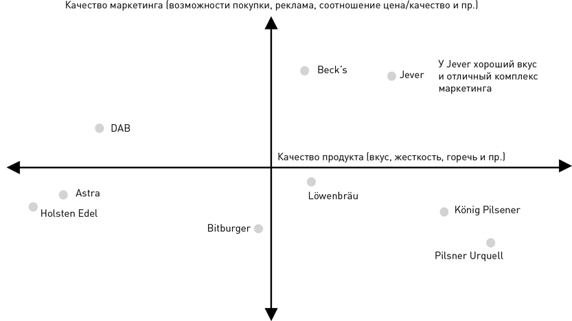 Этому примеру уже несколько лет, но он наглядно демонстрирует, какие бренды расцениваются как схожие и в каких областях еще есть потенциал для позиционирования. Две оси – это сжатая информация из целого ряда разных параметров, и точка пересечения делит график на положительное и отрицательное восприятие. Соответственно, позиционирование Jever – лучшее в этом анализе, а у Holsten Edel – худшее. Потребители считают Pilsner Urquell и K?nig Pilsener больше похожими друг на друга, чем, например, Pilsner Urquell и Beck's. Если говорить о ценности бренда с поведенческой точки зрения, сильные бренды – Jever и Beck's, а у остальных – в соответствии с их позиционированием – есть потенциал для улучшения, в некоторых случаях существенного. Матрица восприятия привлекательна и для новых поставщиков и их продукции, потому что верхний правый квадрант занимают всего два сорта пива.