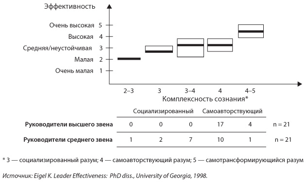 Известный исследователь проблем лидерства Кит Эйгель оценил уровень комплексности сознания 21 президента и CEO[6] крупных успешных компаний, каждая из которых стала лидером в отрасли и имеет средний годовой доход более 5 млрд долл.{3}. (Он использовал методику 90-минутных интервью, которая разработана нами и нашими коллегами. «Субъектно-объектные интервью», описанные ниже, широко использовались во многих странах мира и в разных областях на протяжении более 20 последних лет. Они точно выявляют динамику изменения уровня комплексности сознания у людей, а также тенденции развития в рамках одного уровня.)