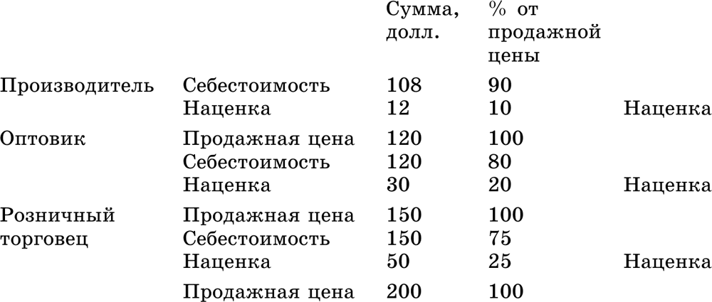 По мере движения товара по каналу распределения каждый член канала (перед тем, как перепродать товар следующему звену) производит на него собственную наценку. Эту «цепочку наценок» иллюстрирует пример с мужским костюмом, за который покупатель платит в магазине Парсонса 200 долл.:
