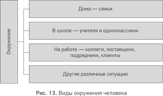 Разные виды деятельности предполагают различное окружение, в рамках которого происходит наше взаимодействие с другими людьми. Дома это, конечно, семья. В школе или университете – преподаватели и товарищи по учебе. На работе – руководители, коллеги, поставщики, подрядчики и клиенты. В общественном транспорте, в кафе, на стадионе или в библиотеке – везде нас окружают люди. Практически все наши действия предполагают наличие окружения (рис. 13).