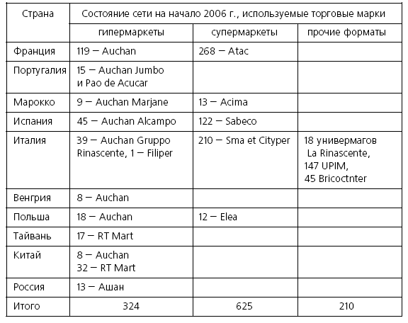 С 1981 г. компания Auchan вышла на международный рынок. Основным принципом ее деятельности стало последовательное развитие сети гипермаркетов по всему миру.