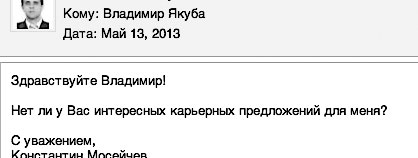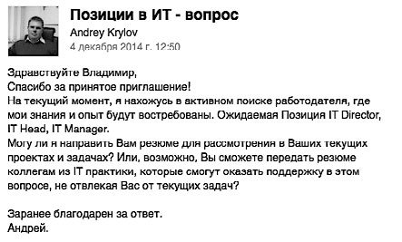 Приведу несколько примеров писем, которые приходят ко мне в основном через Linkedln и «Профессионалы, ру», хотя меня находят и в сети «ВКонтакте», и в Facebook и задают те же вопросы (рис. 10.1-10.5).