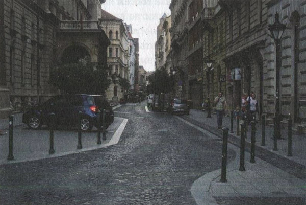 Рис. 1.2. «Дискриминационные» меры по отношению к автомобилистам: искусственные изгибы, в данном случае — поочередная парковка с разных сторон улицы — заставляют водителей сбрасывать скорость. Будапешт, Венгрия (фото: Илья Варламов www.varlamov.ru)