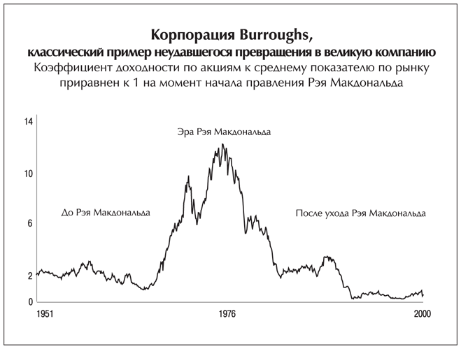 Например Рэй Макдональд, который возглавил Burroughs в 1964 году. Умный, но тяжелый человек, Макдональд всегда доминировал в разговорах, шутил только сам и критиковал тех, кто не был столь же умен (а это были практически все вокруг). Сила его характера была основным движущим фактором в компании, и этот тип давления получил название «порок Макдональда»{231}. Макдональд добился удивительных результатов в период своего правления. Каждый доллар, инвестированный в 1964-м (год, когда он стал президентом), до 1977 года (когда он ушел на пенсию) обеспечил бы доходность в 6,6 раза выше, чем средняя по рынку{232}. Однако у компании не было культуры дисциплины, которая осталась бы без него. После его ухода на пенсию фавориты-помощники, парализованные собственной беспомощностью, начали уходить из компании, по словам Business Week, «будучи неспособны что-либо сделать»{233}. Burroughs начала скатываться, доходность по ее акциям упала на 93 % ниже среднего показателя по рынку с конца эры Макдональда до 2000 года.