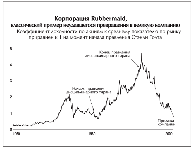 Схожая история имела место на Rubbermaid в период правления Стэнли Голта. В главе о руководителях 5-го уровня упоминалось, как Голт бросил в ответ на обвинение в тирании: «Да, но я тиран искренний». Голт добился установления в Rubbermaid строжайшей дисциплины: хорошо поставленное планирование и анализ деятельности конкурентов, систематические исследования рынка, анализ рентабельности, жесткий контроль над издержками и так далее. «Это невероятно дисциплинированная организация, – писал один аналитик. – Все, что бы ни делала Rubbermaid, отличает исключительная основательность»{234}. Точный и методичный, Голт приходил на работу в 6.30 и работал по 80 часов в неделю, ожидая, что его менеджеры будут делать то же самое{235}.