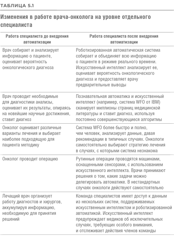 Вернемся к примеру из области лечения онкологических заболеваний, который мы уже рассматривали ранее. Вспомним, как благодаря искусственному интеллекту кардинально меняются схемы диагностики и подбора лечения, как социальные роботы – помощники хирургов – позволяют врачам проводить менее инвазивные и более точные операции. В главе 3 мы уже обсуждали эту ситуацию, объясняя, как следует пересматривать содержание работы специалиста в поисках оптимальной комбинации человека и машины для ее выполнения. Табл. 5.1 разъясняет, как в данном случае вследствие автоматизации изменилась работа врача на уровне отдельного специалиста.
