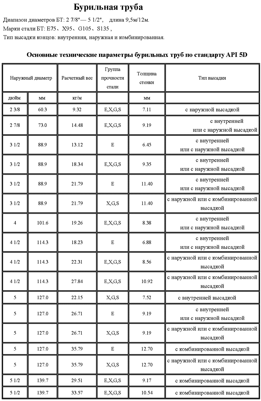 Бурильные трубы изготовлены из высококачественной легированной стали типа AISI4137H. Замок приваривается к бурильной трубе с применением способа инерционной сварки трением. Все параметры заранее фиксированы и весь процесс сварки происходит под управлением компьютера. В потоке производства все трубы подвергаются термической обработке. После обработки, согласно стандартам API SPEC 7 проводятся следующие методы неразрушающего контроля качества труб: магнитопорошковая дефектоскопия, ультразвуковая дефектоскопия, проверка тела бурильных труб на поперечные и объемные дефекты, контроль толщины стенок и других механических характеристик.