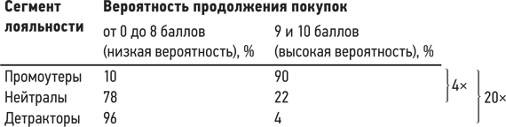 Наши исследования показали, что около 90 процентов промоутеров с высокой степенью вероятности продолжат покупать продукты компании в дальнейшем, тогда как всего 4 процента детракторов продемонстрировали такую готовность. В целом вероятность продолжения покупок в сегменте промоутеров была в четыре раза выше, чем в категории нейтралов, и в двадцать раз выше, чем у детракторов.