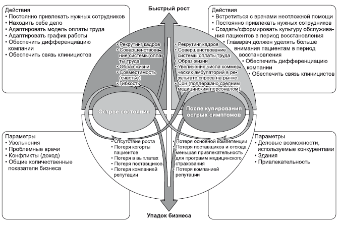 Компании, обладающие хорошим пониманием контекста, обычно замечают новые рыночные возможности по мере их возникновения. Во время моей работы в Чикагской областной больнице в IPC the Hospitalist Company (IPC) мне стало ясно, что вследствие изменений на рынке у компании появляется новая возможность. Если компания захочет воспользоваться ею, руководству придется управлять важным парадоксом, чтобы обеспечить дальнейший рост. Анализ, проведенный Энн Лоу из Hoover's, показал, что IPC — «флагман усиливающегося интереса к специализации больничных врачей (госпиталистов)»38. IPC предоставляет услуги более чем 1400 госпиталистам в 28 штатах в сфере управления и администрирования.