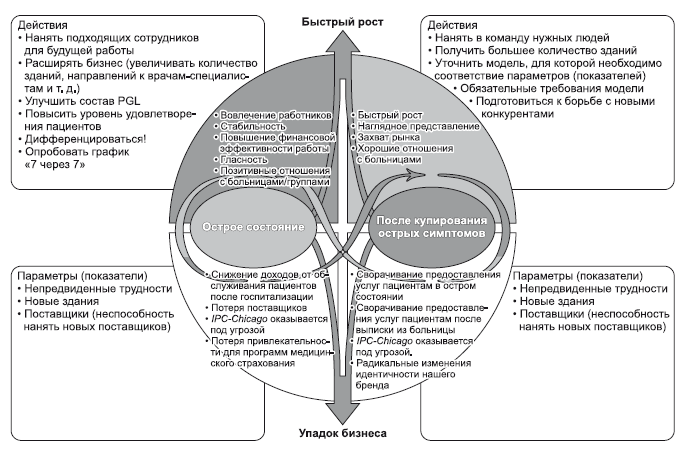 Ключевые совпадения касаются стратегий найма и удержания работников, технической эксплуатации и увеличения количества помещений, в которых IPC оказывает медицинские услуги, и управления отношениями с поставщиками. Соответствующие параметры появляются во всех трех моделях; например, неспособность удержать сотрудников видна в количестве увольнений. Такие совпадения неслучайны. Это отражение того, что руководство в понятной форме доводит до сведения работников наличие возможностей для госпиталистов на рынке в Чикаго. В конечном итоге первые предпринятые шаги, соответствующие тем, которые были перечислены в списке поддержки обслуживания пациентов в остром состоянии, способствовали модификации способов найма новых врачей-терапевтов, изменению пакета компенсаций и внедрению новых мер для удержания врачей, уже работающих в больнице. Были предприняты дополнительные действия, необходимые для сохранения конкурентоспособности в области поддерживающей терапии больных, выписанных из больницы. Этот процесс одновременного выполнения пунктов действий и отслеживания параметров продолжается и в настоящее время, когда IPC Chicago внедряет новые инициативы на рынке обслуживания пациентов после выписки из больницы.