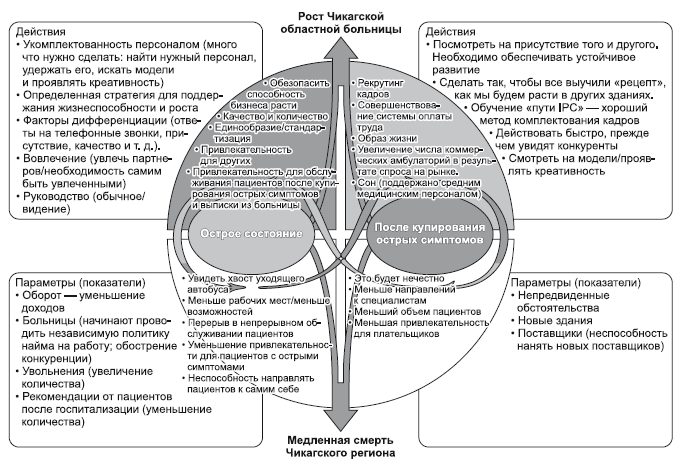 Тройка топ-менеджеров, которые впервые работали со мной над выявлением парадокса и моделированием всех его аспектов, отличалась различными предпочтениями в мышлении (см. главу 3 и дискуссию о HBDI). Было очень интересно смотреть, как сильные стороны и склонности каждого из участников обсуждения дополняли друг друга в процессе того, как мы составляли исходную карту для пациентов в тяжелом состоянии и пациентов после купирования острых симптомов.