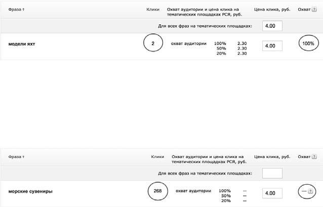 1. В интерфейсе Яндекс. Директ для кампаний на РСЯ можно увидеть, что при изменении ставки меняется процент охвата. Поднял ставку – получил 100 % охвата, снизил – оставил себе только 20. А на многие ключевики стоит прочерк – это означает, что по ним Яндекс ничего сказать не может. Практика показала, что эти цифры не имеют никакого отношения к реальности. (Статью с доказательством можно найти в моём блоге: direct-all-in.ru/blog). Порой ключевики с прочерком дают большое количество кликов, а другие при обещанном 100 %-ном охвате ни разу не показываются. Поэтому не обращай на это никакого внимания. Лучше добавить больше спорных ключевиков и потом постепенно их удалять, чем сразу удалить все ключевики, по которым показы маловероятны. Но помни, что не стоит использовать ключевики длиннее четырех слов – с них почти наверняка не будет выхлопа.