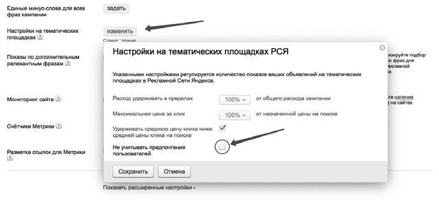 2. В своё время в сообществе специалистов по контекстной рекламе появилась настоящая бомба: разделение на тематический и поведенческий таргетинг. Есть такая галочка в параметрах кампании: «не учитывать предпочтения пользователей», которая отключает поведенческий таргетинг. Однако галочки, которая отключила бы тематический таргетинг, не существует в природе (актуально на февраль 2016 года).