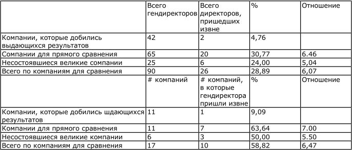 Таблицы показывают число генеральных директоров каждой компании, выбранных среди сотрудников, и тех, кого пригласили со стороны. Для каждой из великих компаний были включены все генеральные директора за 10 лет до начала преобразований и до 1998 года. Для компаний прямого сравнения был выполнен аналогичный анализ с использованием временного интервала соответствующей великой компании. Для каждой несостоявшейся великой компании был проанализирован период за 10 лет до ее неудачной попытки добиться выдающихся результатов и до 1998 года. Мы включали всех генеральных директоров, которые, придя в компании, оставались на посту год или даже менее.