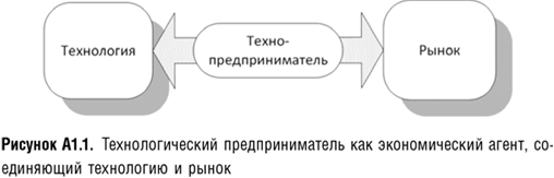 Бизнесмены, которые находят применение новым технологиям, являются технологическими предпринимателями. Они используют новые технологии как движущую силу, как конкурентное преимущество. Австро-американский экономист Йозеф Шумпетер[252] первым обратил внимание на роль предпринимателя как инноватора или агента изменений. Шумпетер определяет предпринимателя как человека, который создает радикальные инновации, а не постепенную модернизацию. Предложенное Шумпетером определение радикальных инноваций как «новых комбинаций ресурсов» (нем. Neue Kombinationen) получило широкую известность; и действительно, предпринимательство связано с созданием новых «комбинаций» уже известных различных технологий или технологий и рынков. Во времена Шумпетера такие новые «комбинации» создавались в основном независимыми предприятиями, которые в случае успеха вытесняли традиционные фирмы на различных этапах жизненного цикла продукта и занимали их место, сами становясь со временем зрелыми компаниями. Шумпетер назвал этот процесс «созидательным разрушением». Сегодня довольно часто новые «комбинации» возникают внутри крупных компаний[253]. Но в любом случае технологические предприниматели изменяют окружающий мир, принося на рынок такие неизвестные ранее явления и предметы, как огонь, колесо, бронза, железо, паровой двигатель, электричество, телекоммуникации, полимеры, твердотельная электроника, фармацевтические препараты, источники возобновляемой энергии и т. д. Таким образом, технологический предприниматель выступает посредником между технологией и рынком (рис. A1.1).