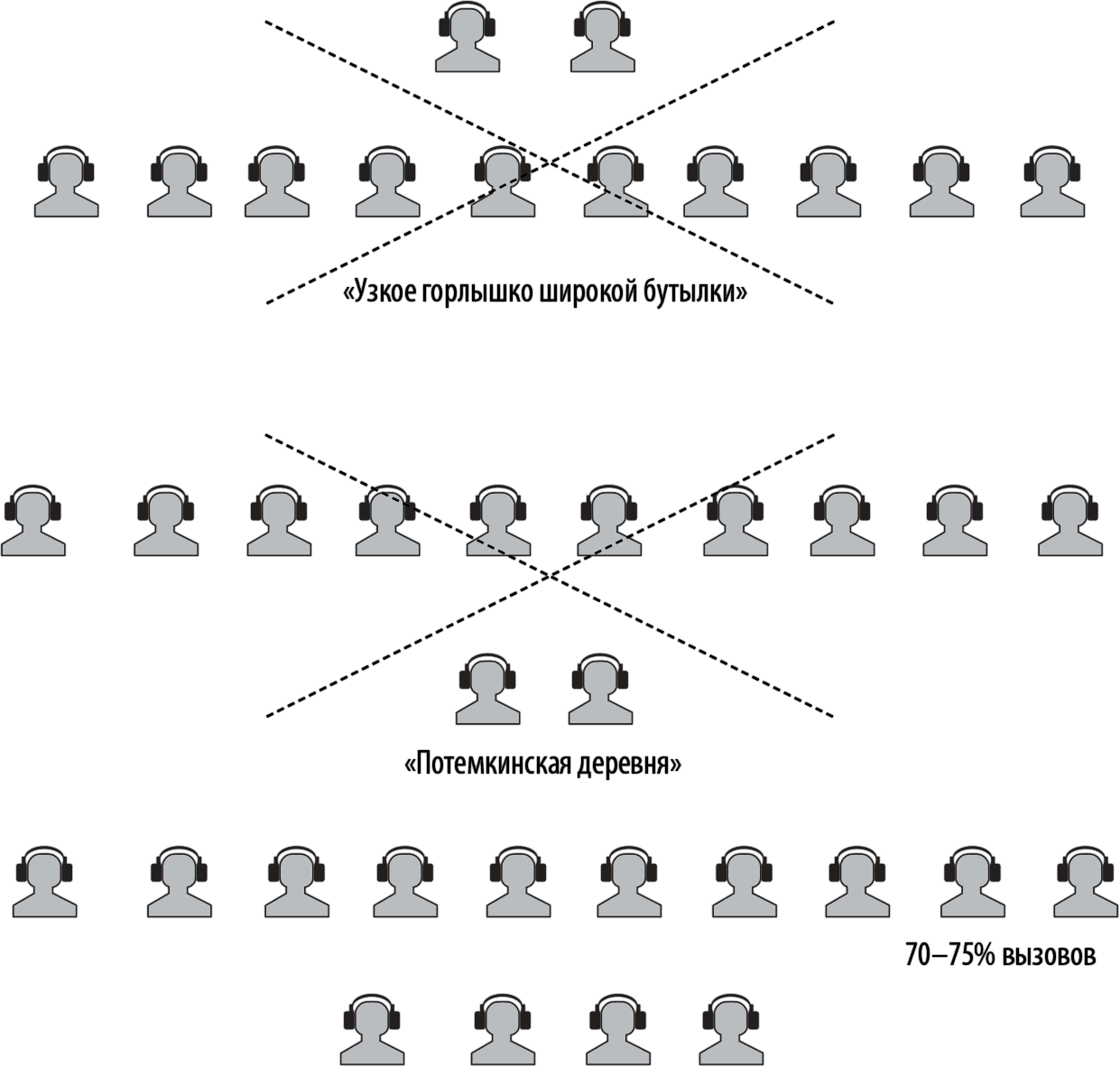 Теперь сформулируем главные принципы, позволяющие эффективно организовать двухуровневую структуру обслуживания вызовов (рис. 4.5). Во-первых, необходимо следить, чтобы «первая линия обороны» не превращалась в «узкое горлышко широкой бутылки». Особенно этим грешат небольшие колл-центры. Устроят иногда из двух-трех девушек чистой воды коммутатор, а потом удивляются, почему клиенты недовольны обслуживанием.