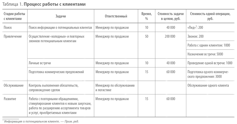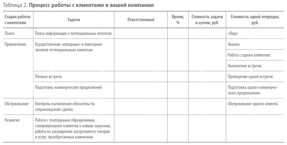Давайте начнем эту часть книги с небольшого, но очень важного задания, благодаря которому вы узнаете «сколько стоит» выполнение тех или иных работ вашими продавцами. В табл. 1 можно увидеть типовой процесс работы с клиентами, состоящий из четырех стадий: поиска, привлечения, обслуживания и развития. Во втором столбце перечислены основные задачи, выполняемые на каждой стадии. Эти задачи могут значительно отличаться в зависимости от рынка, товара, специфики целевой аудитории и пр. Например, у компаний, работающих с клиентами исключительно по телефону, не будет личных встреч, у других, не имеющих индивидуальных коммерческих предложений, соответственно, подготовки таковых и т. д.