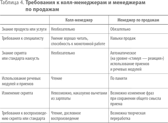 Скрипты для колл-менеджеров должны быть простыми, исключающими какую-либо возможность творчества. Здесь действует принцип «Шаг влево, шаг вправо – побег, прыжок на месте – провокация». Совсем другое дело – стандарты для менеджеров по продажам, представляющие собой, скорее, арсенал знаний, набор заранее отработанных приемов, доведенных до рефлекторного уровня ответов на действия собеседника в той или иной сложной ситуации. В отличие от колл-менеджера менеджеру по продажам приходится сталкиваться с гораздо б?льшим количеством вариантов действий собеседника. К тому же при работе с клиентом лицом к лицу, а не по телефону невозможно читать заготовленные фразы скрипта. Так что, в то время как колл-менеджер практически не имеет никакого пространства для творчества, а любая его попытка сработать не по скрипту расценивается как нарушение и наказывается, менеджер по продажам обладает гораздо б?льшим количеством степеней свободы и волен сам выбирать, какой прием или алгоритм имеет смысл применить. В последующих разделах книги мы подробнее разберем специфику внедрения скриптов для колл-менеджеров и стандартов для менеджеров по продажам. Различия в требованиях к колл-менеджерам и менеджерам по продажам сведены в табл. 4.