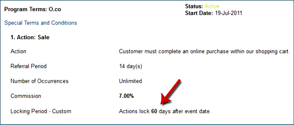 Большинство партнерских сетей позволяет рекламодателям самостоятельно установить время, в течение которого они могут редактировать и отменять транзакции (в зависимости от того, как быстро они проверяют достоверность продажи, их опыта работы с возвратами и других причин, влияющих на изменение размера вознаграждения). Например, в сети Commission Junction время обработки по умолчанию истекает 10-го числа месяца, следующего за тем, когда произошла транзакция, в то время как в ShareASale это происходит 20-го числа. В случае использования собственного времени обработки, как в партнерской программе рекламодателя Overstock.com (недавно переименованного в O.com), это время привязано к количеству дней после оформления заказа и равно «60 дням после события» (см. изображение ниже).