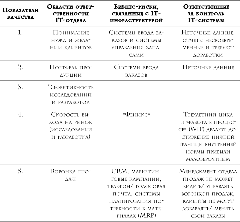Я сажусь прямо и начинаю излагать то, что уже много раз обсуждал со своей командой. «Мне нужно по три недели с каждым руководителем по всем бизнес-процессам из вашего списка. Нам необходимо разобраться в связи между бизнес-рисками и IT-инфраструктурой, чтобы затем мы могли предложить вам способ интеграции данных рисков в ведущие показатели компании. Наша цель – не исправить бизнес-показатели, но получить более тонкие индикаторы, которые на ранней стадии покажут нам, можем ли мы выполнить обязательства или нет, давая нам возможность предпринять все необходимые действия.