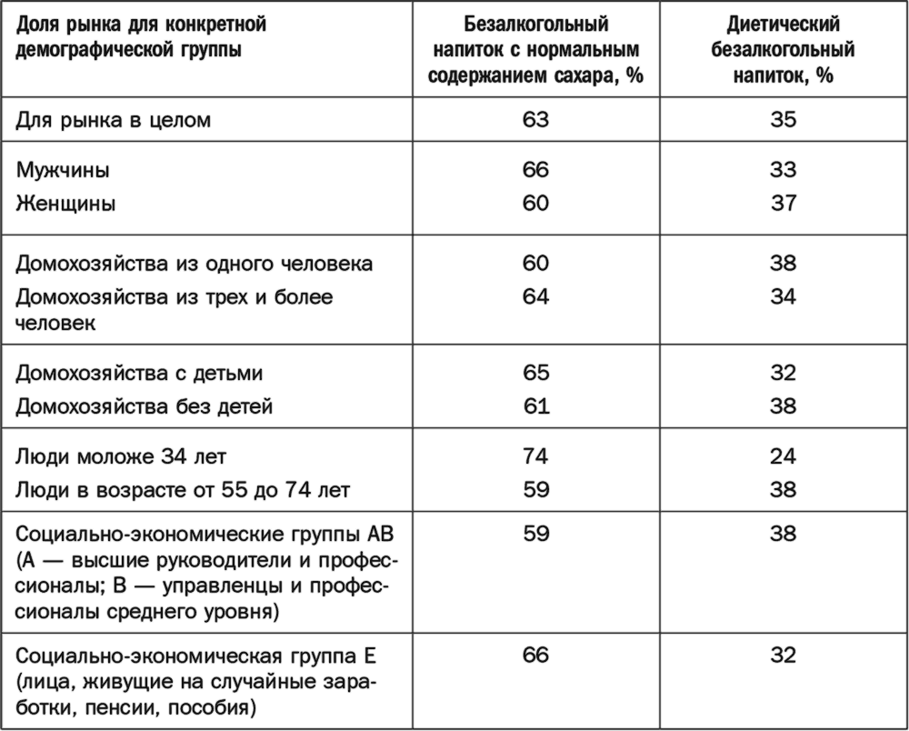 В табл. 5.9 представлены обычные доли рынка для обычных безалкогольных напитков (доля рынка составляет 63 %) и диетических / не содержащих сахара (доля рынка – 35 %), а далее – их доли рынка среди конкретных демографических групп[49]. Подобный анализ, часто фигурирующий в докладах по исследованию рынка (где нередко применяются индексы), способен преувеличивать различия. Заявляется, что можно иметь чрезвычайно высокую долю рынка, но в очень малочисленной демографической группе, тогда как ваша потребительская база в целом не слишком отличается от других. Я намеренно выбрал такой стиль анализа, чтобы показать даже мельчайшие потенциальные различия, но, как вы сами видите, демонстрировать здесь особо нечего. Просмотрите сверху вниз показатели сначала в одном столбце, затем в другом. Напиток с нормальным содержанием сахара в целом имеет 2/3 доли рынка – и почти столько же в каждой демографической группе. У диетической разновидности напитка доля рынка составляет 1/3 как в целом, так и по каждой демографической подгруппе. Так что ни один из вариантов не обладает особой притягательностью для какого-либо из сегментов (и это несмотря на многолетние попытки рекламой диетических напитков «зацепить» женскую аудиторию)[50].